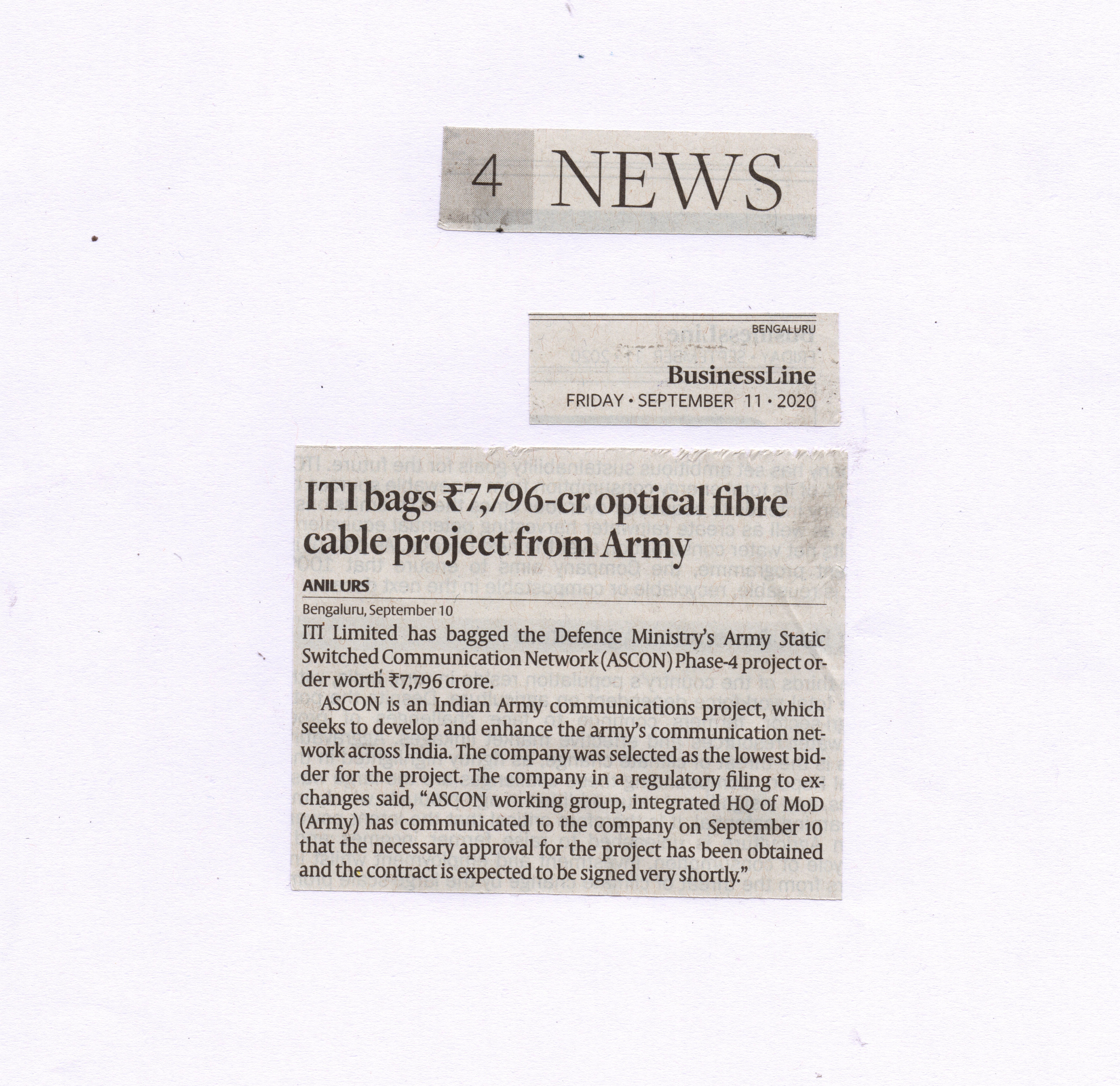 Media Coverage of ITI gears up to bid for BSNL's 4G tender (460 KB, EN)